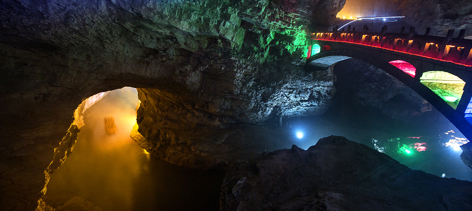 黃龍洞,一座形成于3.8億年前的大自然的迷宮,高闊的洞天,幽深的暗河,懸空的瀑布,密集的鐘乳石,匯聚成氣勢雄偉的洞穴大觀。目前,黃龍洞已探明的洞底總面積是10萬平方米,全長7.5公里,垂直高度140米,內(nèi)分兩層旱洞和兩層水洞。