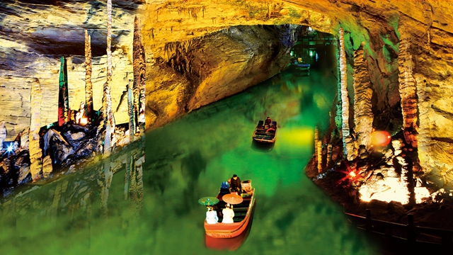 黃龍洞因相傳古代洞內(nèi)有黃龍藏身而得名,1983年經(jīng)當(dāng)?shù)?個(gè)青年民兵發(fā)現(xiàn)探明,1984 年正式對外開放。因洞內(nèi)擁有高闊的洞天、幽深的暗河、懸空的瀑布、上千個(gè)白玉池、數(shù)萬根石筍。
