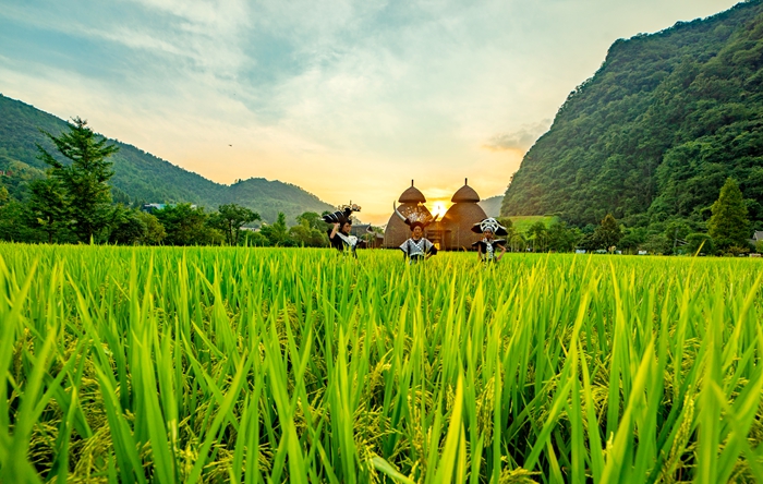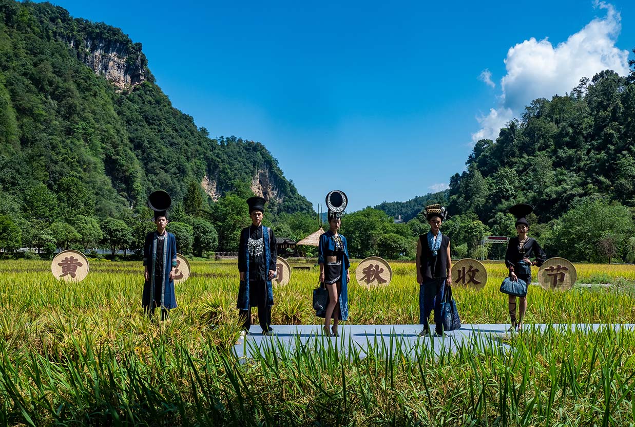 9月19日,在湖南省張家界市武陵源區(qū)黃龍洞景區(qū)生態(tài)稻田,景區(qū)工作人員身著民族時(shí)尚服飾在金黃的稻田間走秀,